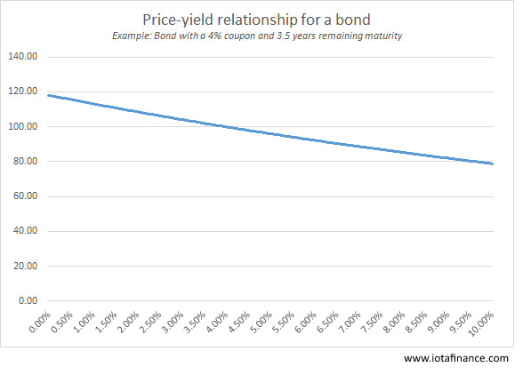 When a bond’s yield rises, be it for example because its issuer has been downgraded by a rating agency or due to a general rise in interest rates, its price will fall, and vice versa.